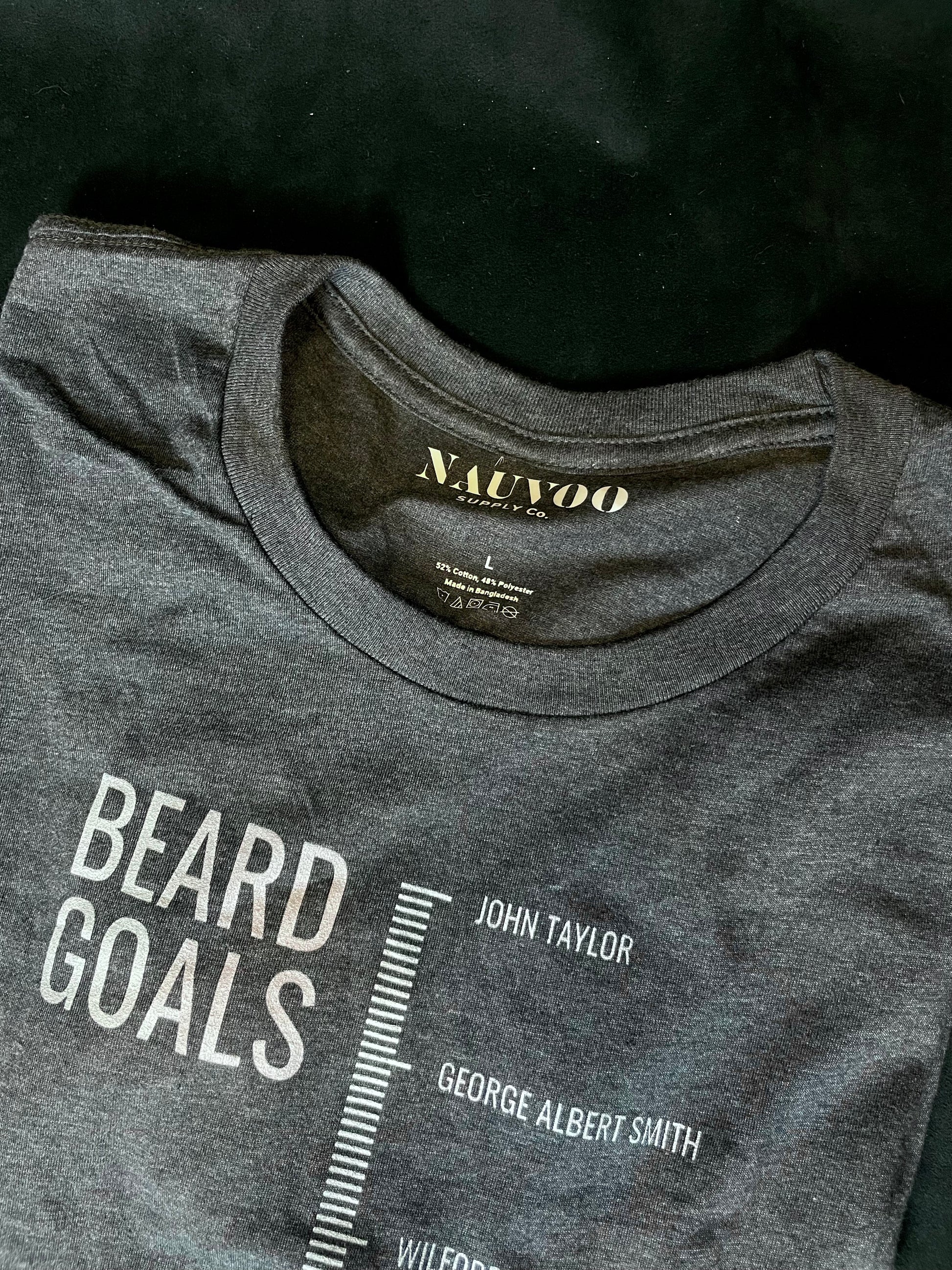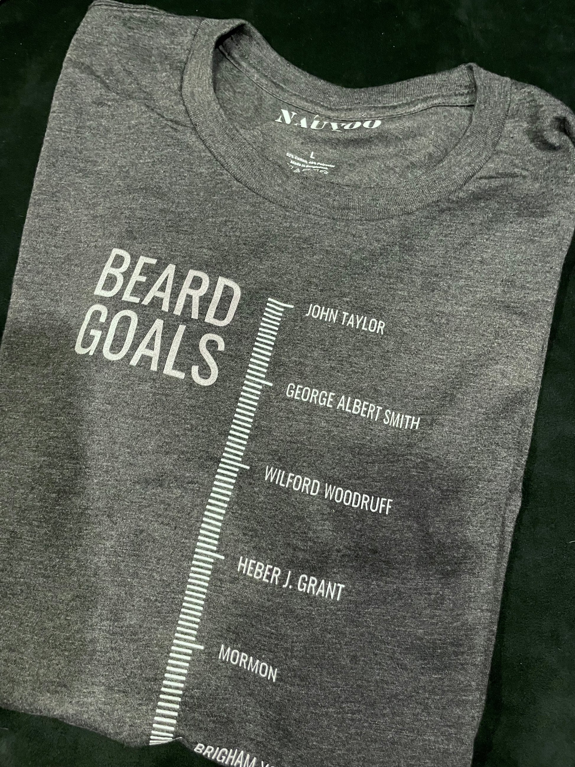 A perfect gift for the bearded LDS dad or grandpa in your life. This fun t-shirt features a ruler showcasing the various beard lengths of some bearded modern prophets and some from the Book of Mormon. This premium soft style t-shirt comes in both black and navy, and is guaranteed to be a conversation starter at family gatherings, your Elder's Quorum taco night, or simply to your next Costco run with the boys. This shirt is sure to bring a smile to the face of any Latter-day Saint with a sense of humor. Truly unique and memorable gift for guys who like their beards.