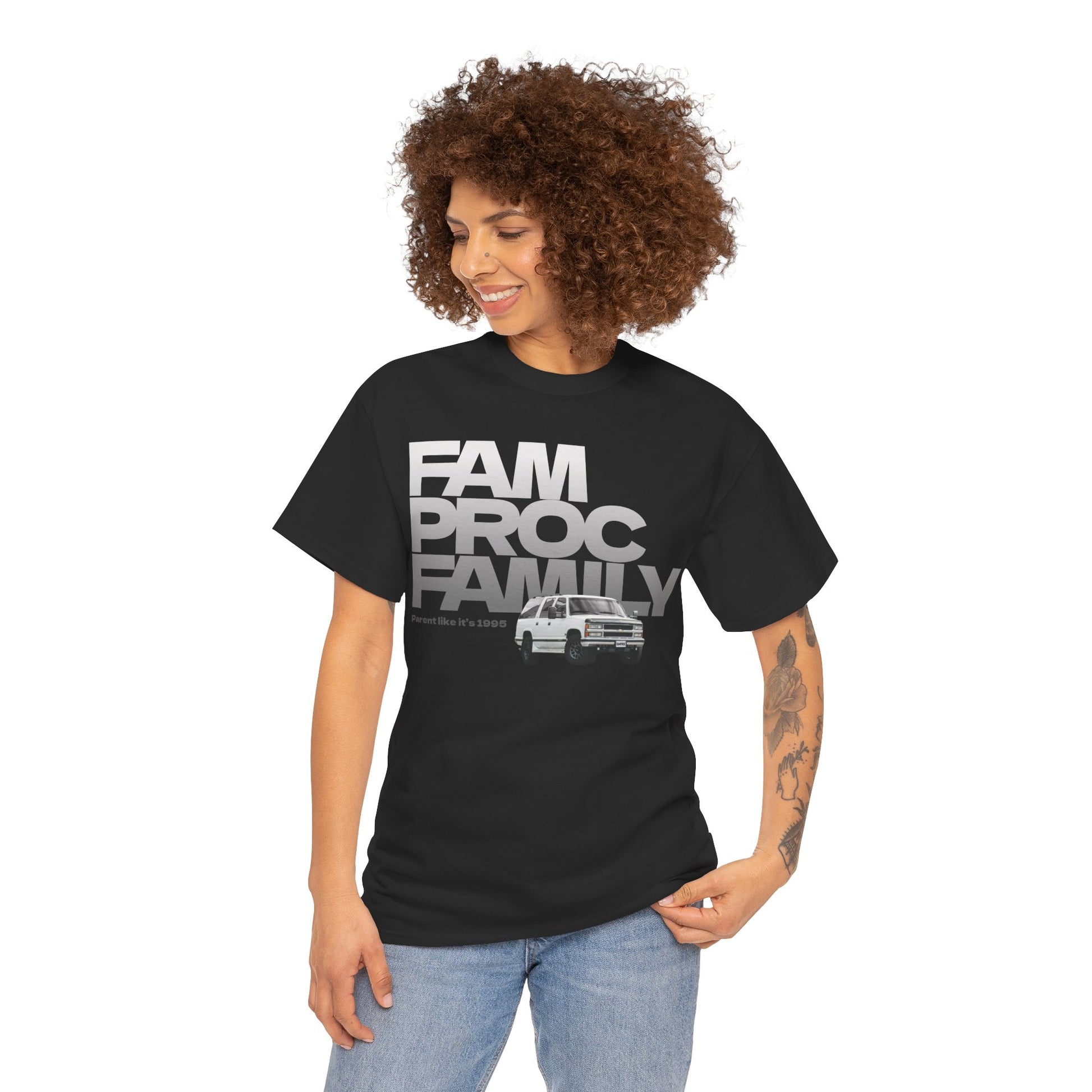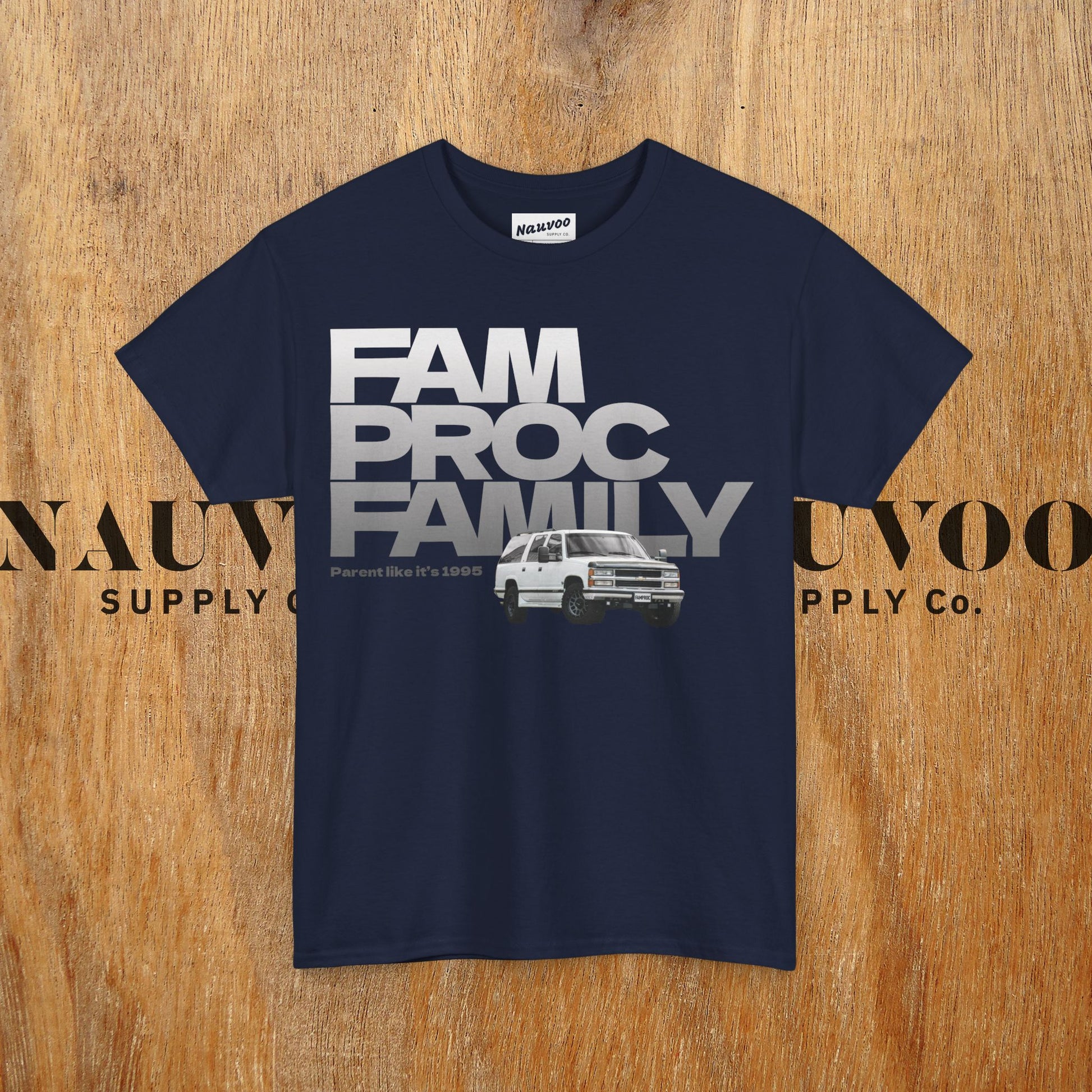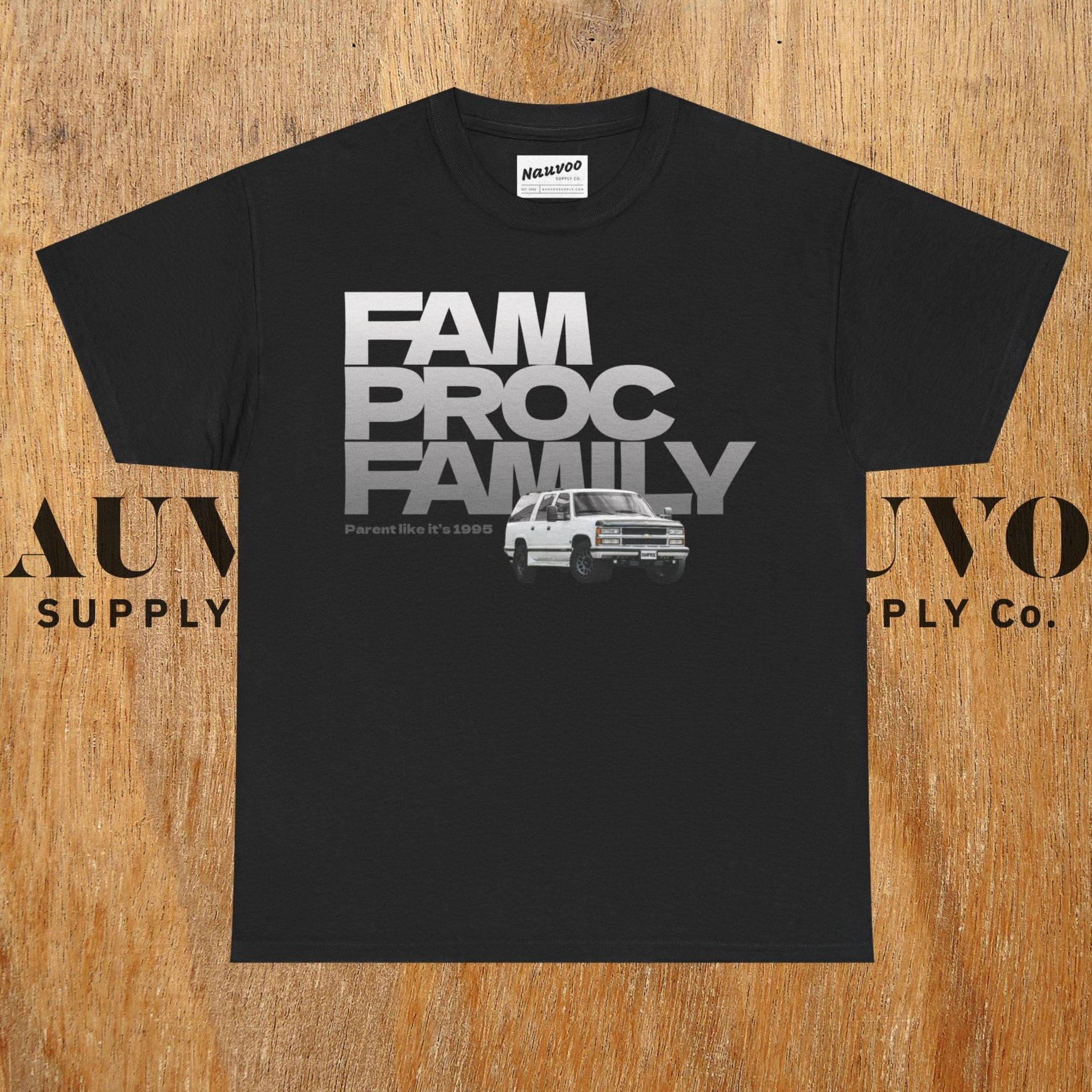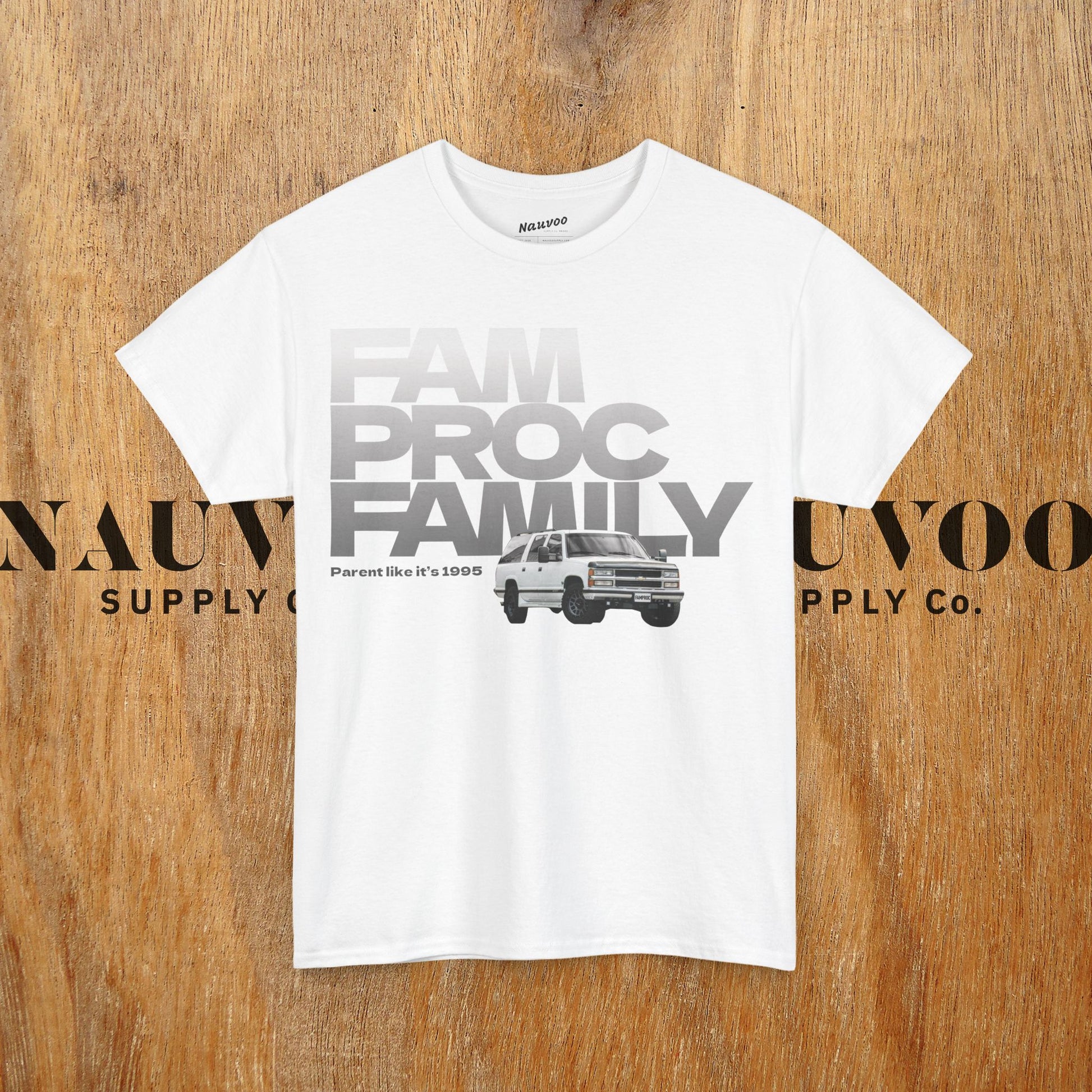 Parent like it's 1995. The First Presidency of the Church of Jesus Christ of Latter-day Saints issued The Family Proclamation in 1995 and this design features an illustration of a Chevy Suburban, which was pretty iconic among large families at the time. We see you, Generation X.