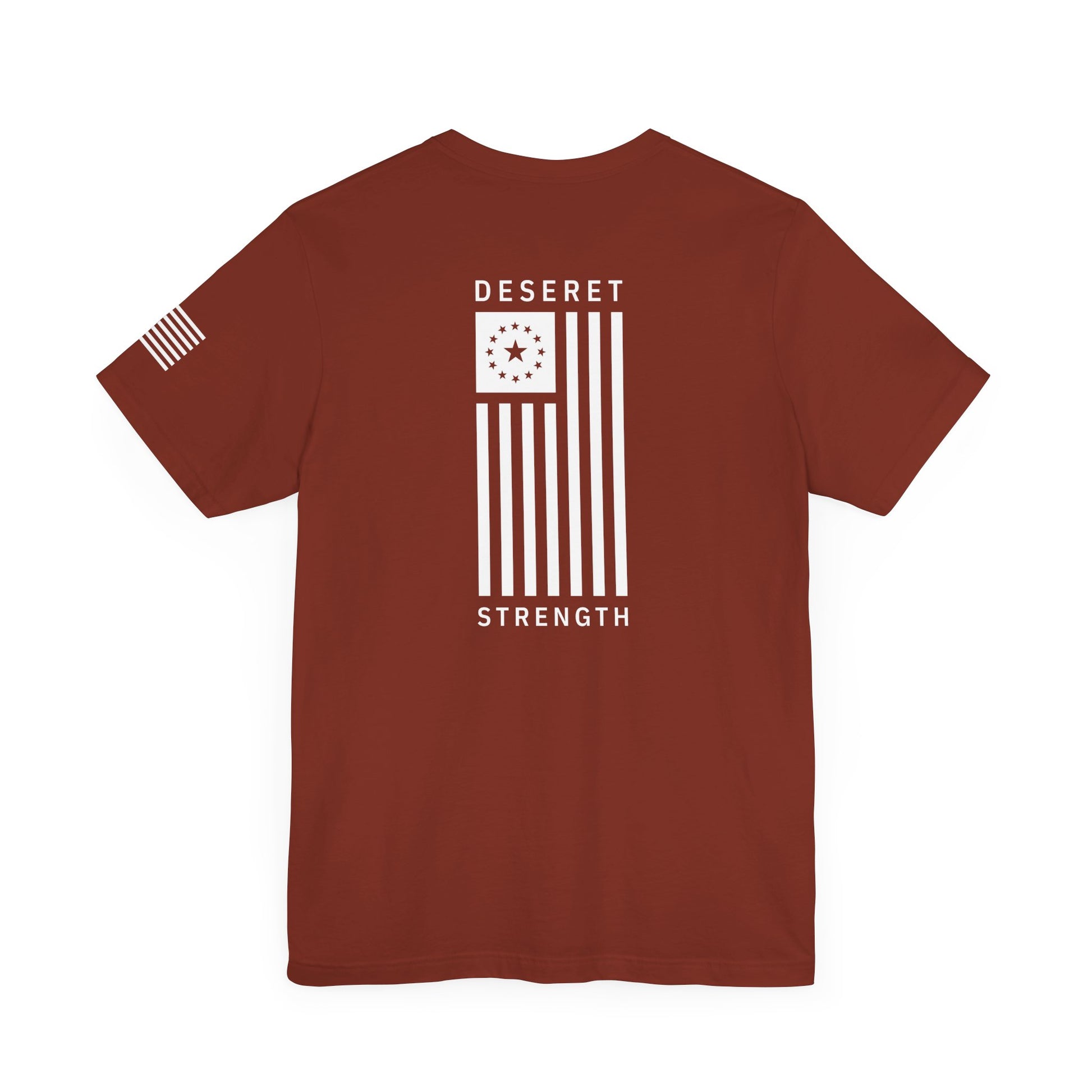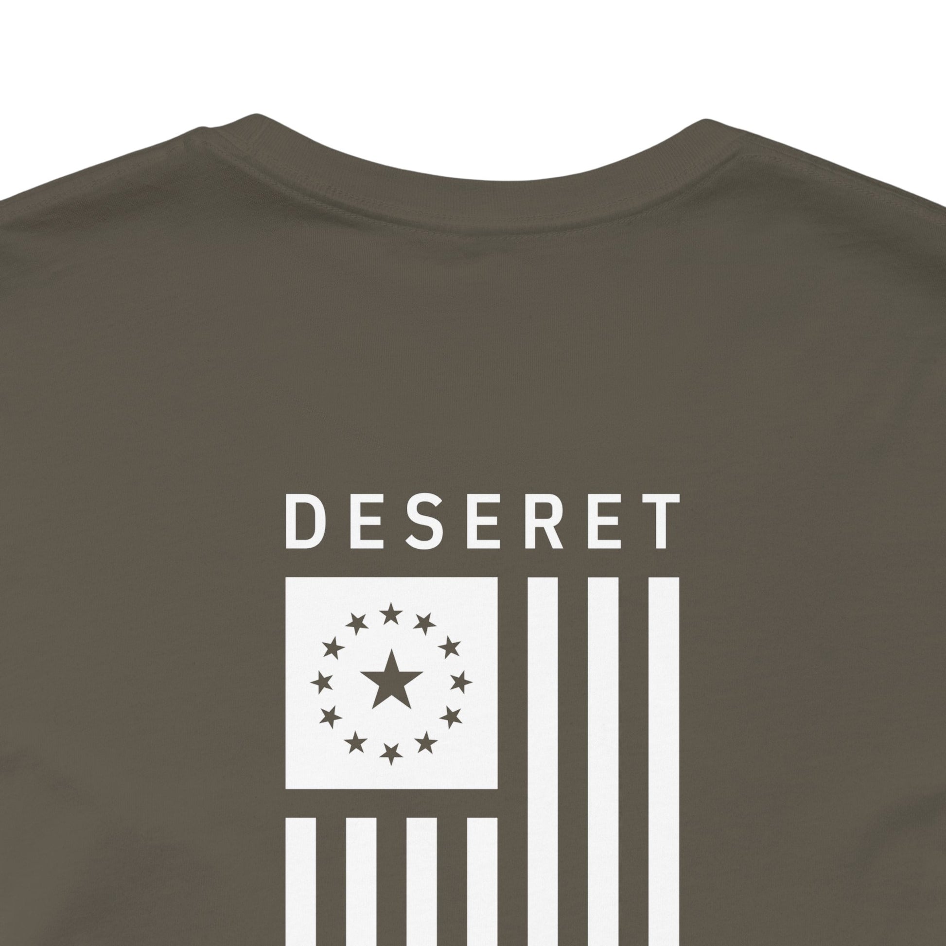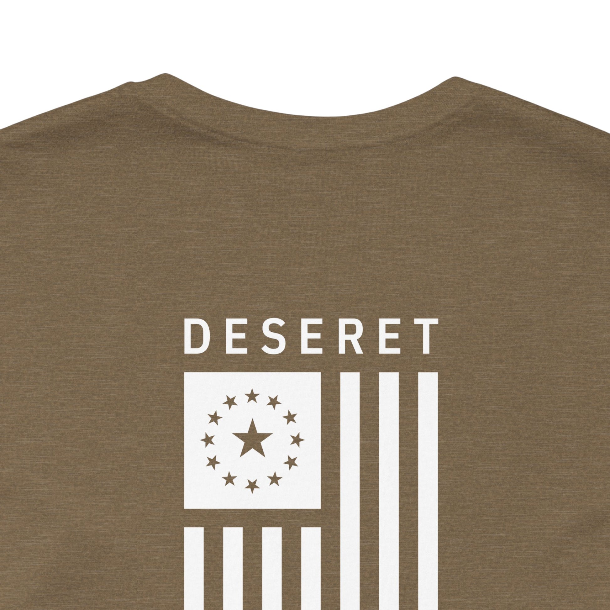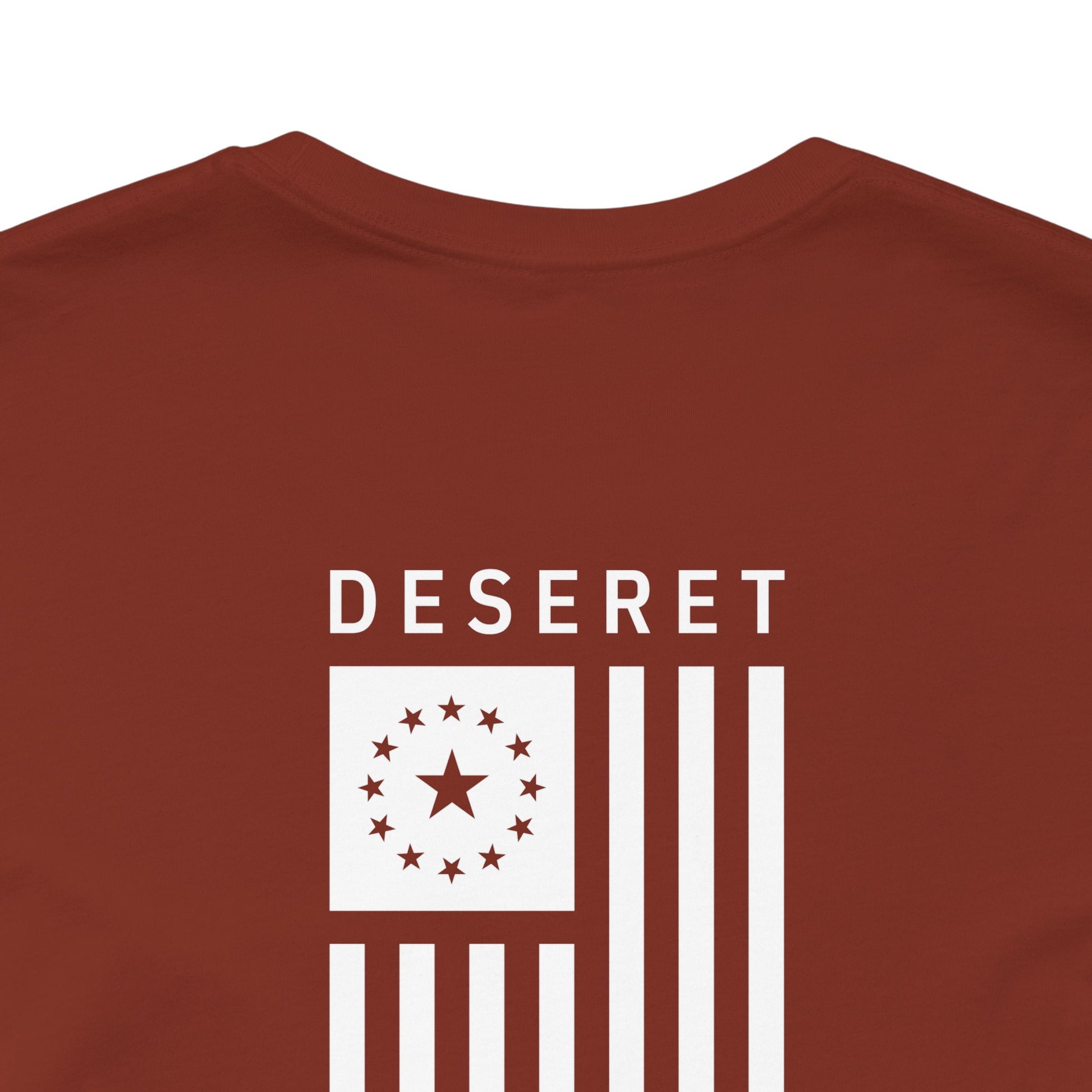 The Deseret flag, also known as the Kimball Maguire flag, was proposed as the flag to represent the territory before Utah gained statehood. This shirt is printed on the front and back.
