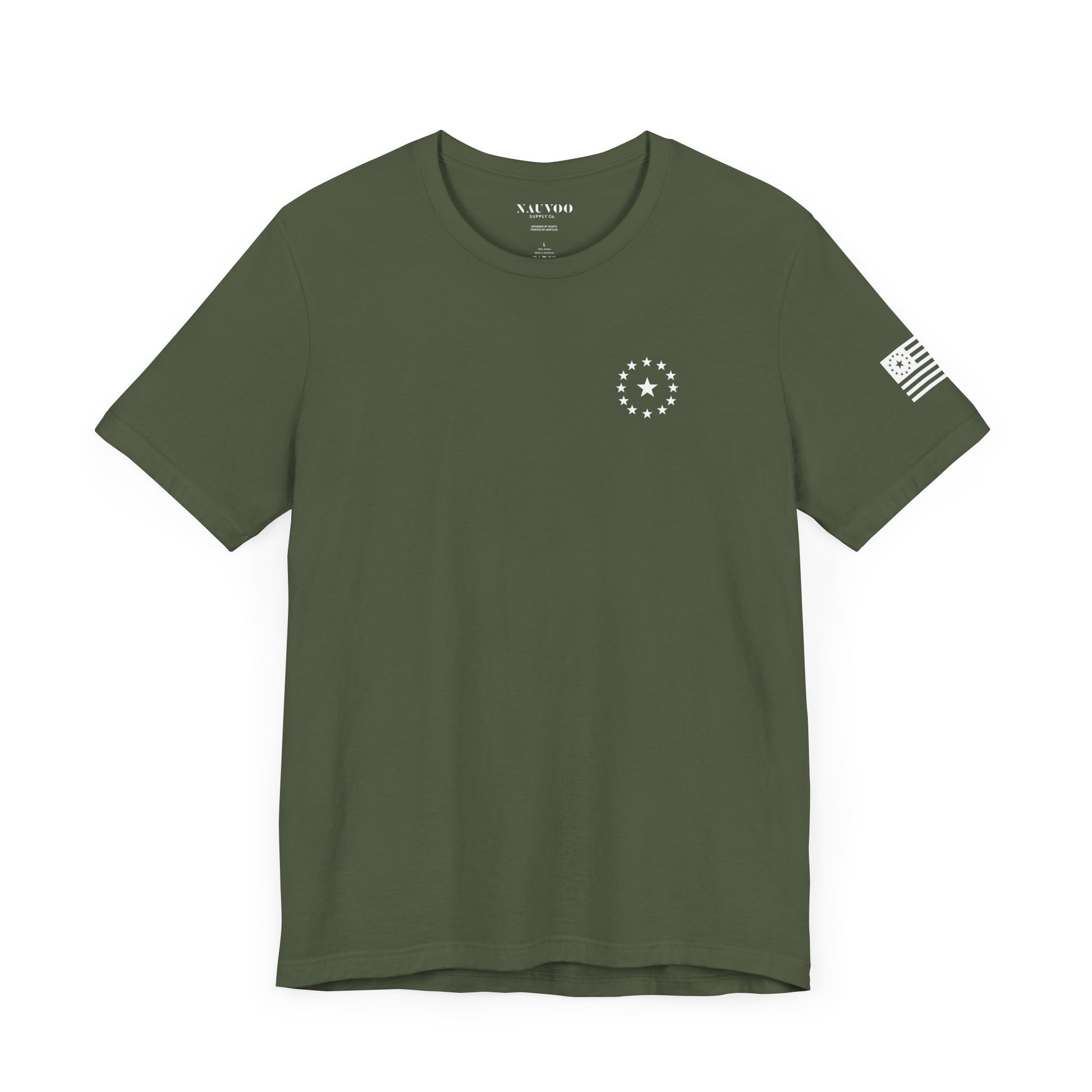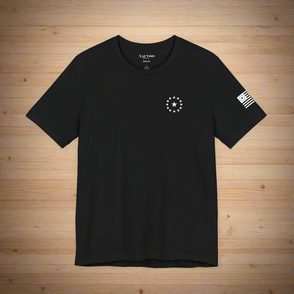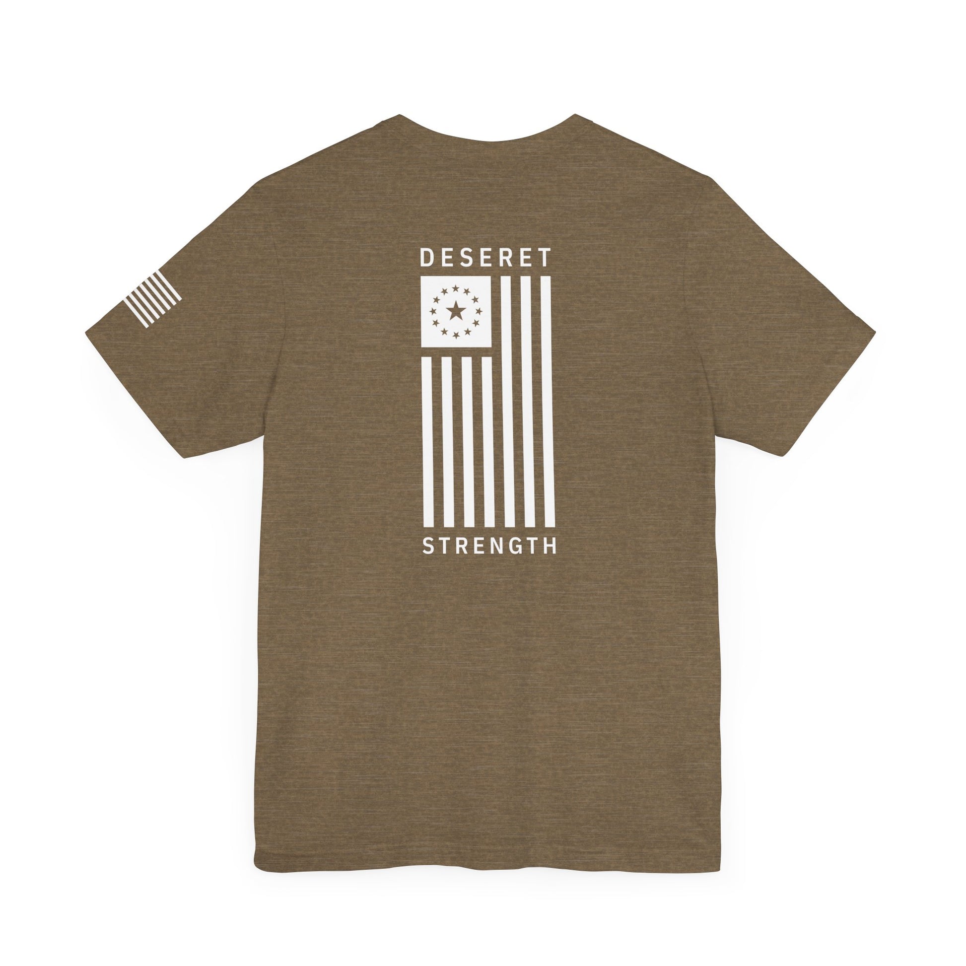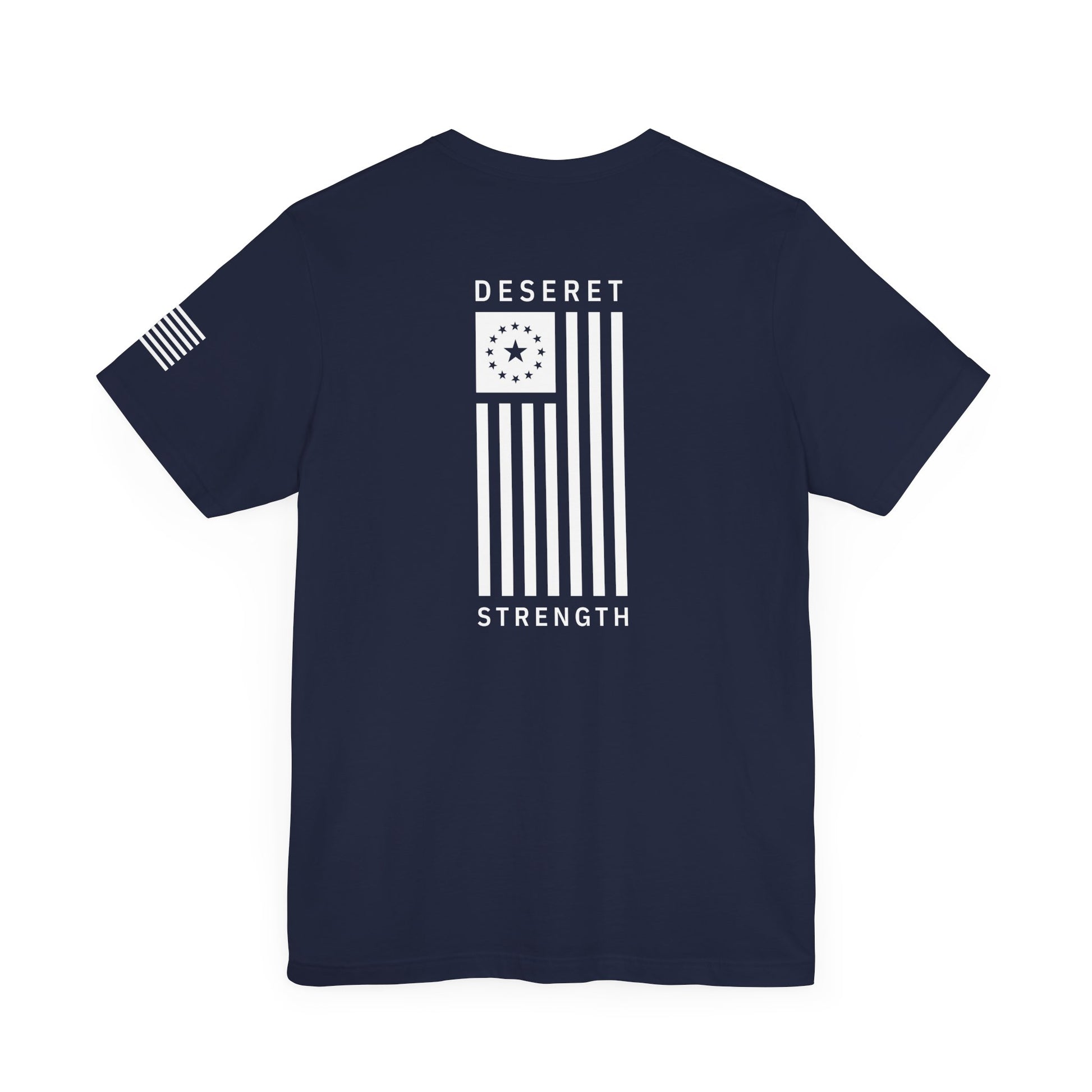 The Deseret flag, also known as the Kimball Maguire flag, was proposed as the flag to represent the territory before Utah gained statehood. This shirt is printed on the front and back.