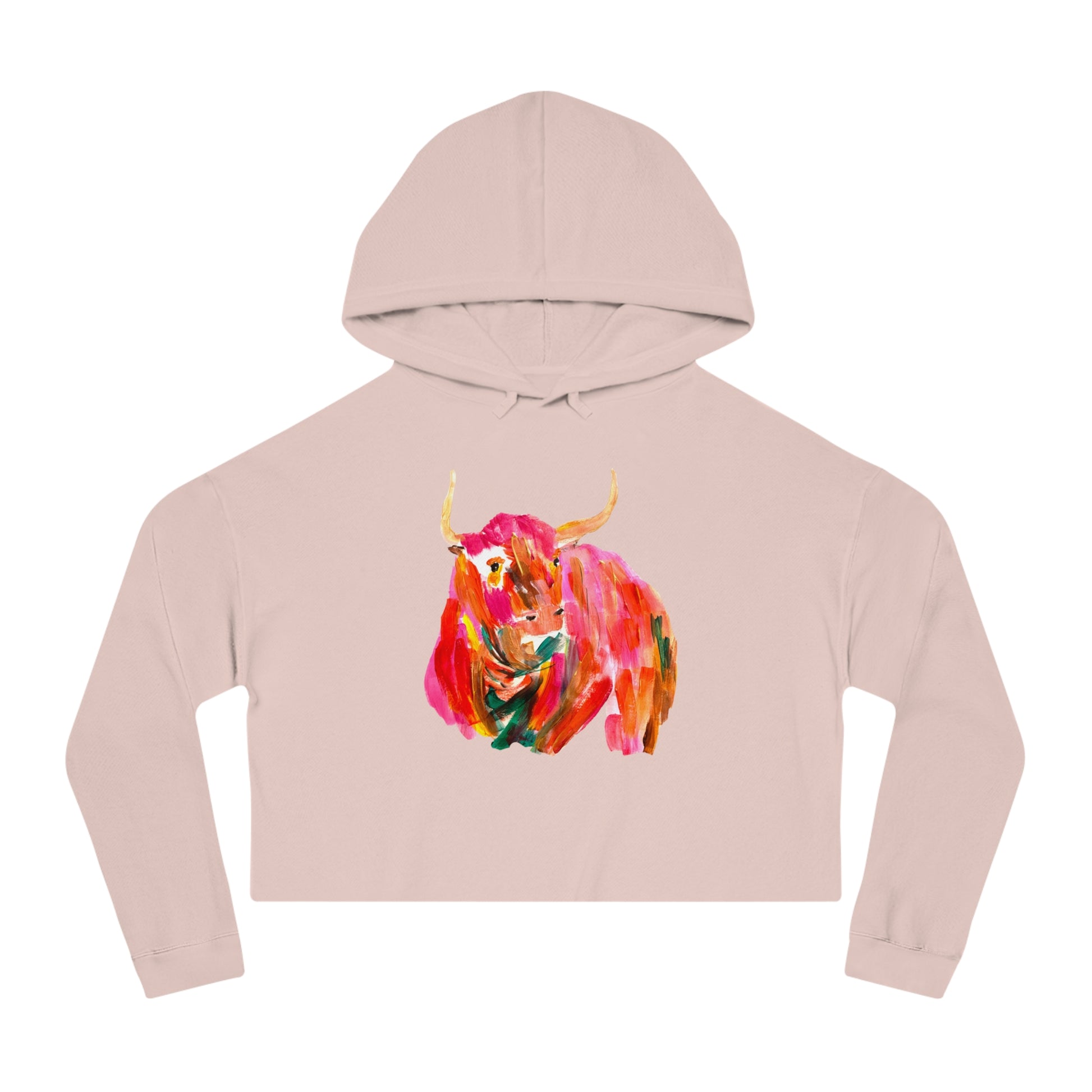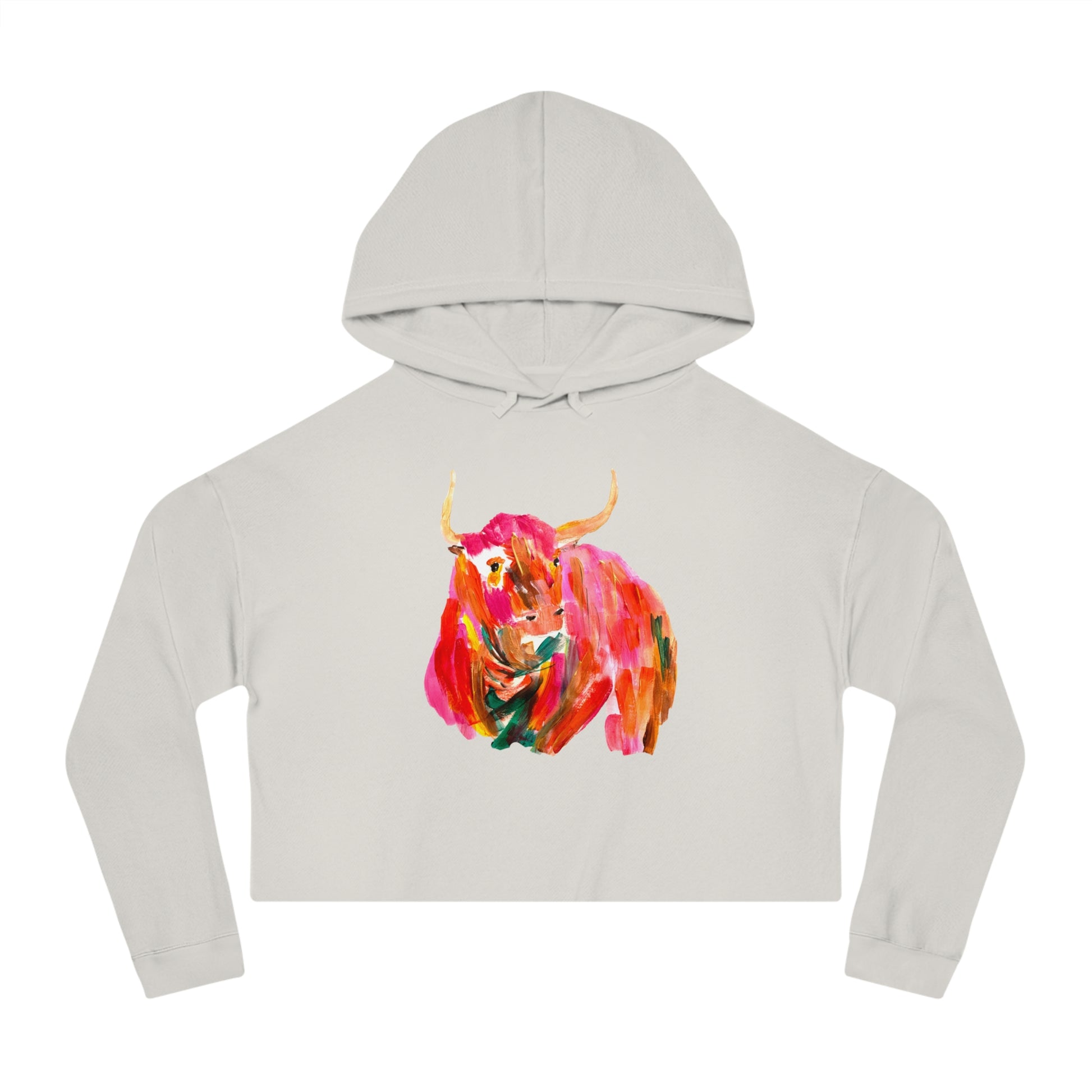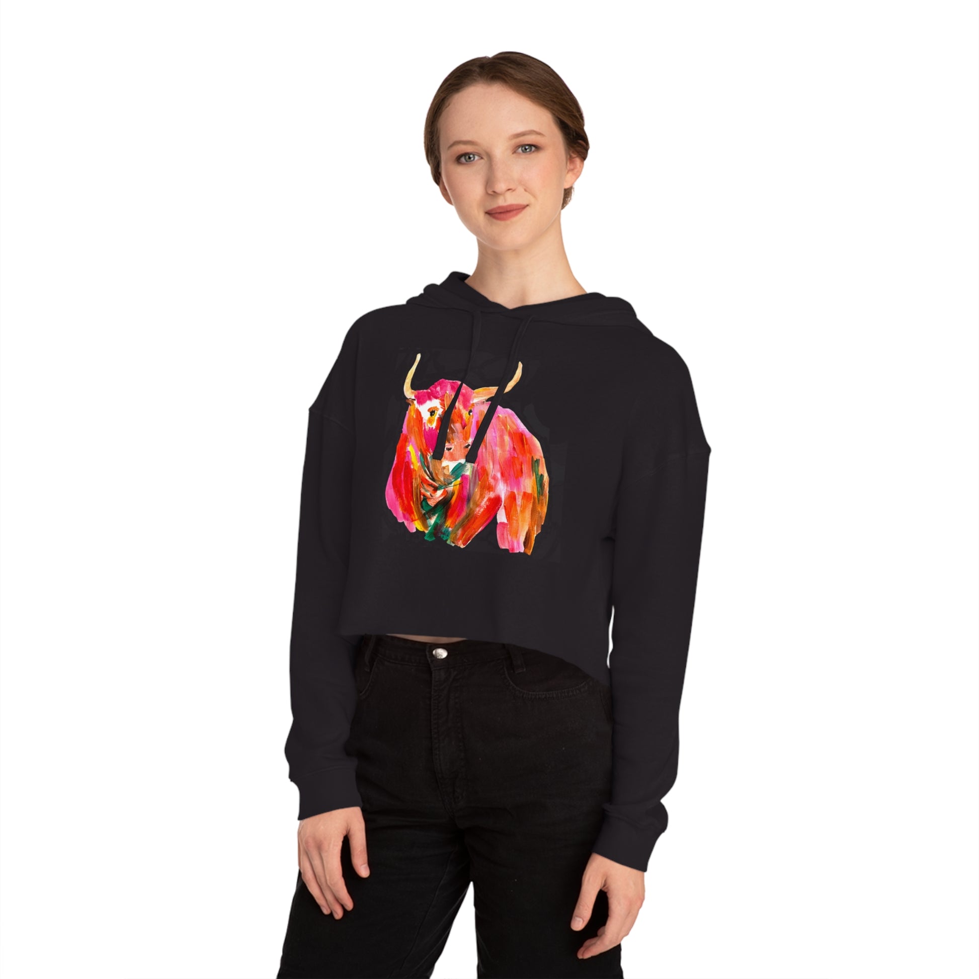Handpainted Bull - Womens Oversized Cropped Hooded Sweatshirt