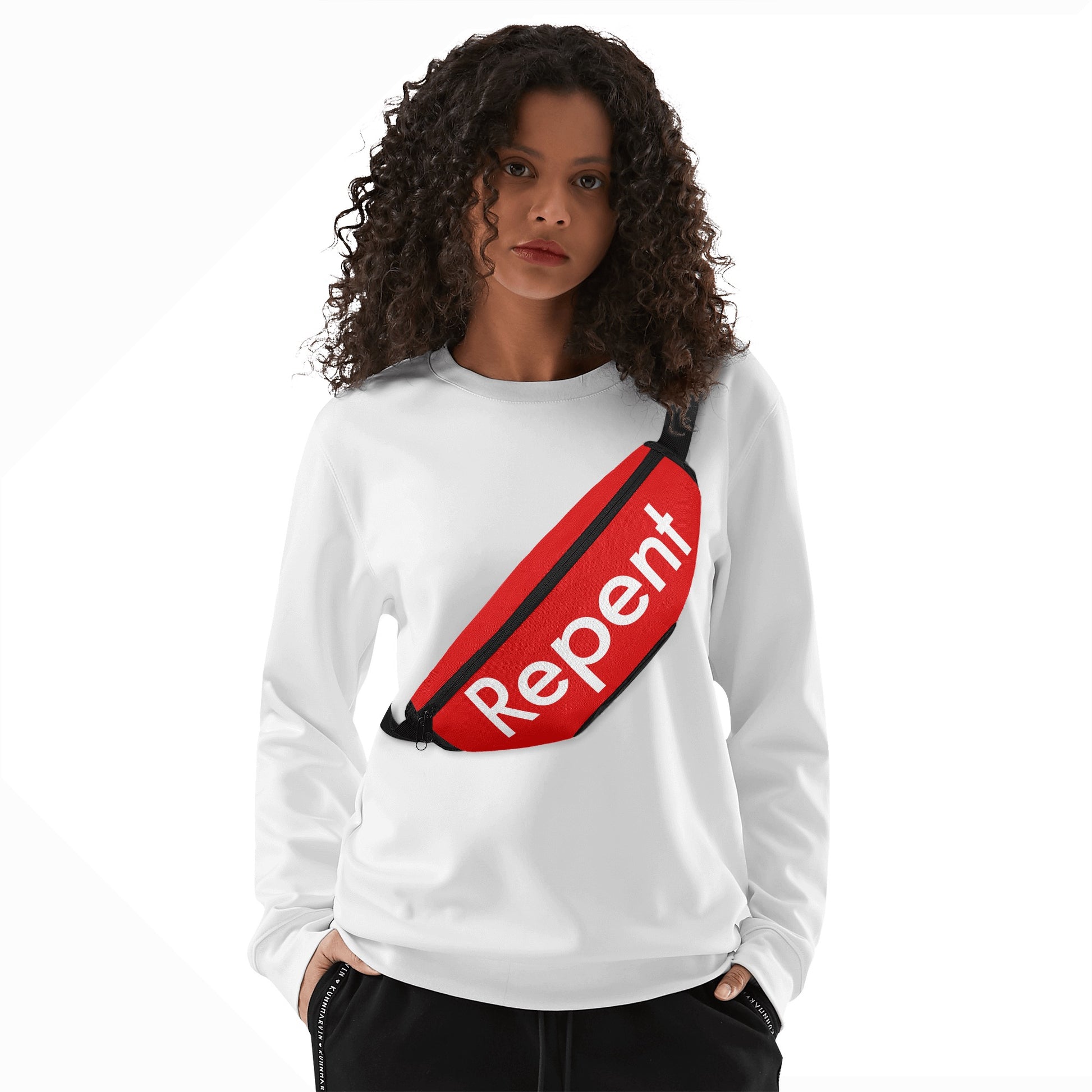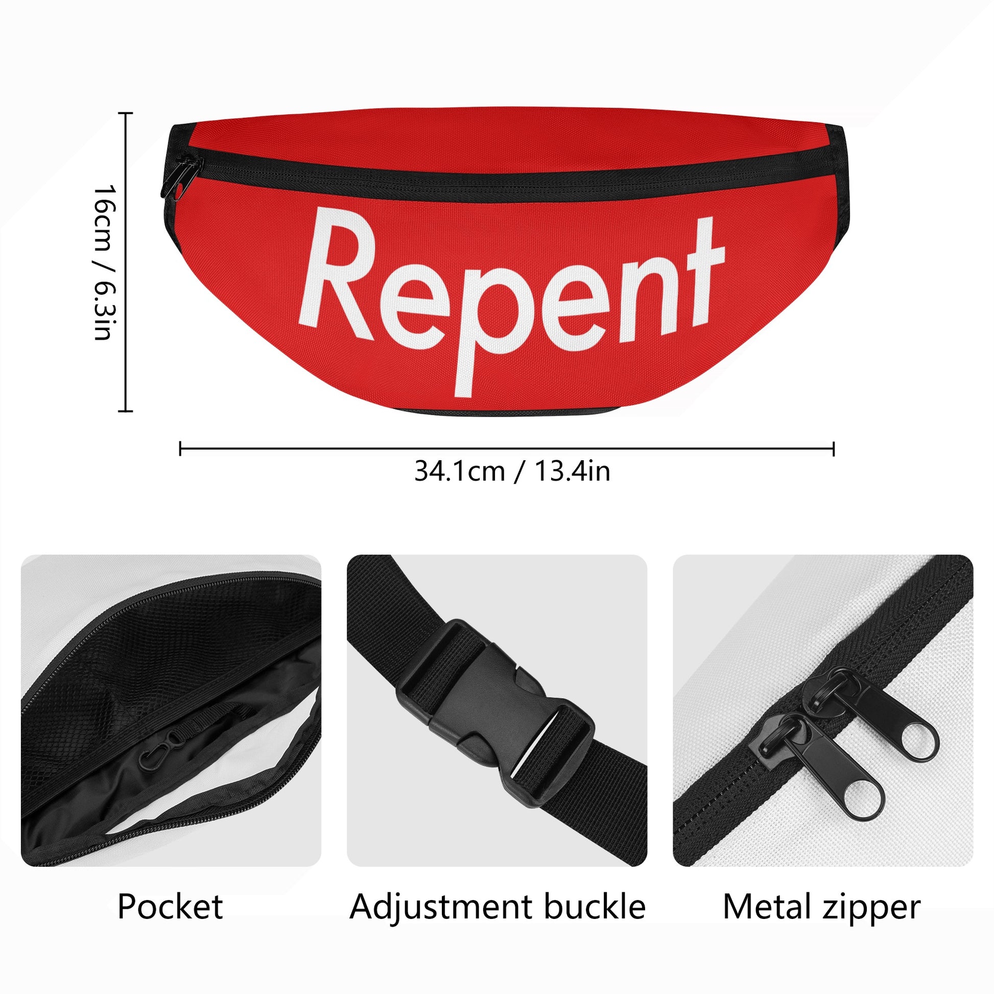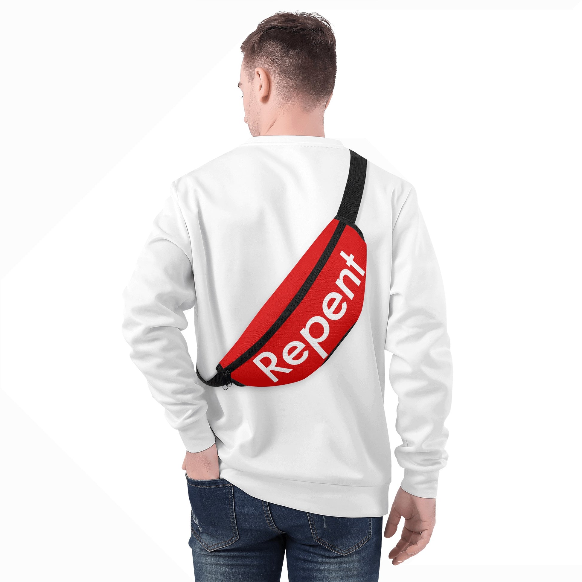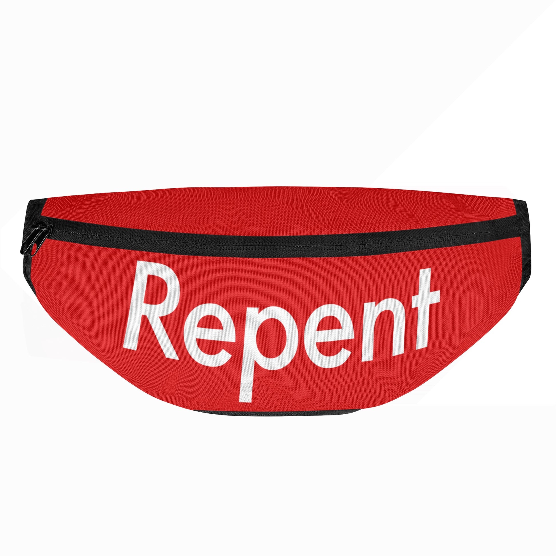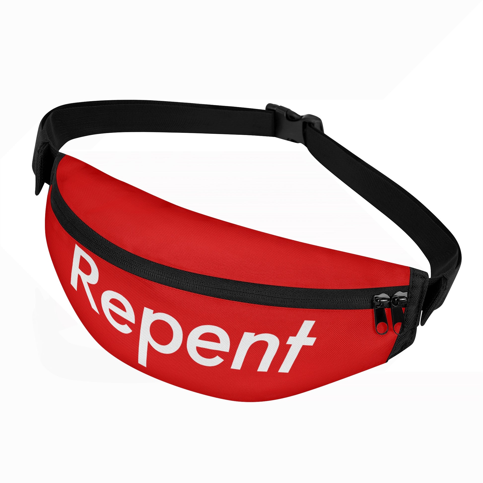 Our Repent design on a medium waist pack, your dad called it a fanny pack, but you don’t have to call it that. Made from premium canvas fabric and a strap with plastic buckle allows it to be adjusted as a cross-body bag or a belt bag. Designed with two-way zip closure for easy access.