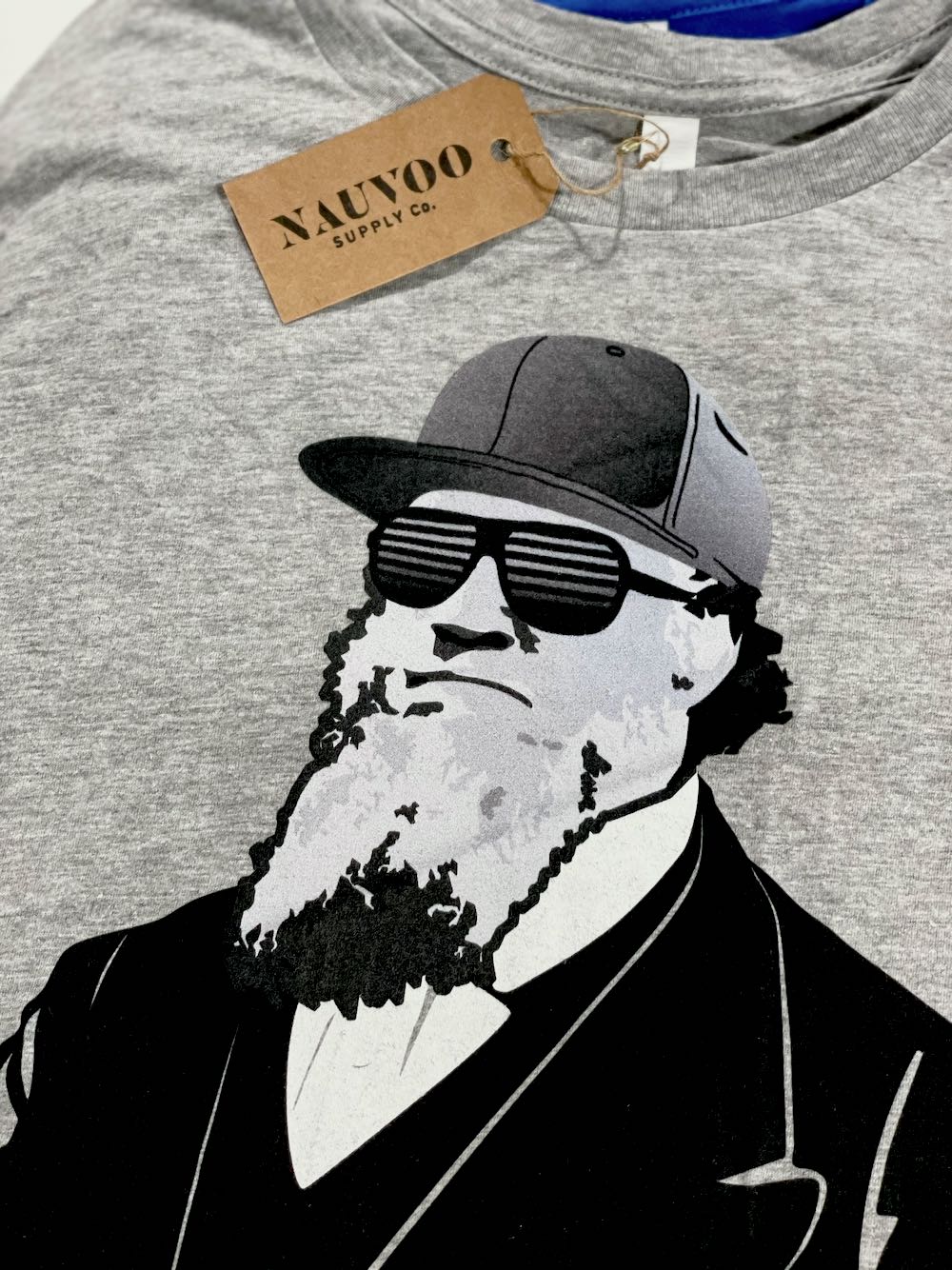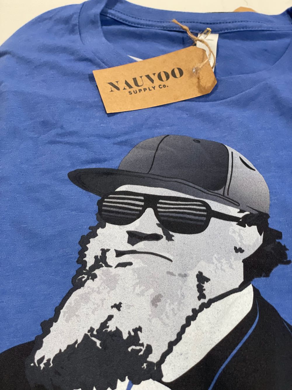 This shirt features an original illustration of Brigham Young by BYU student and LDS illustrator @MsBriggieYoungz. Brigham Young was the longest-serving prophet in the Church of Jesus Christ of Latter-day Saints and in the early Mormon movement he led the Westward pioneer trek across the United States to settle the Salt Lake valley. This design gives him a retro 80s update with shades and a flat brim cap.