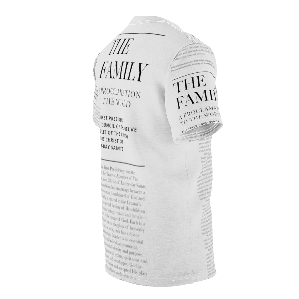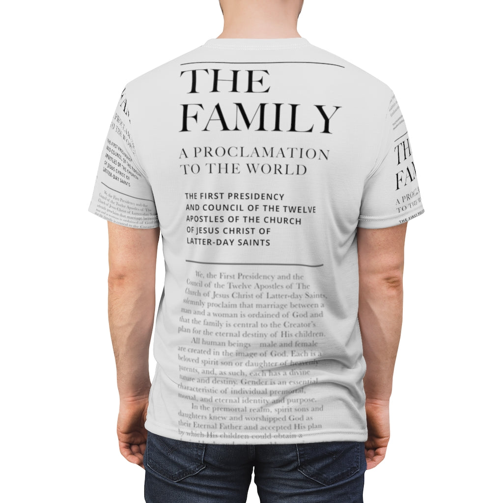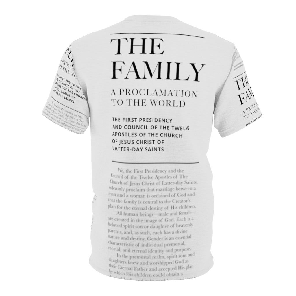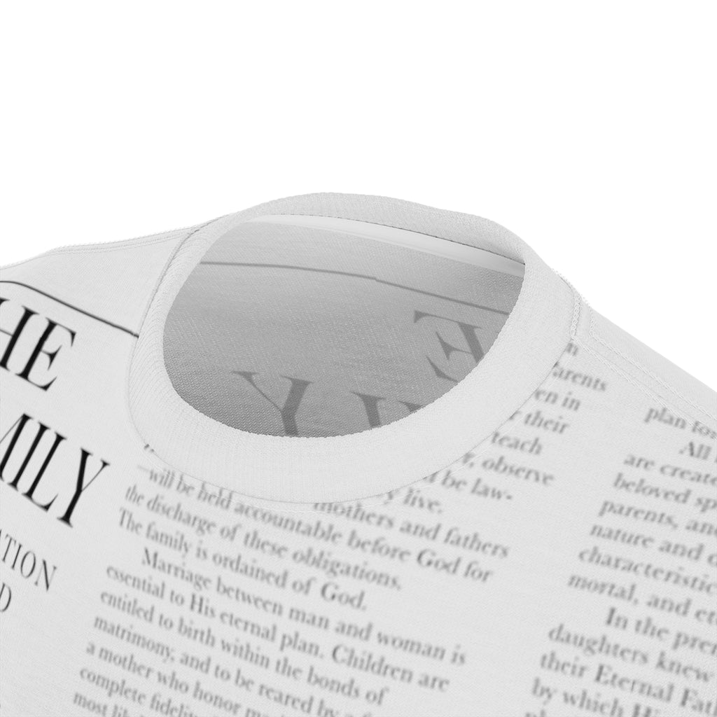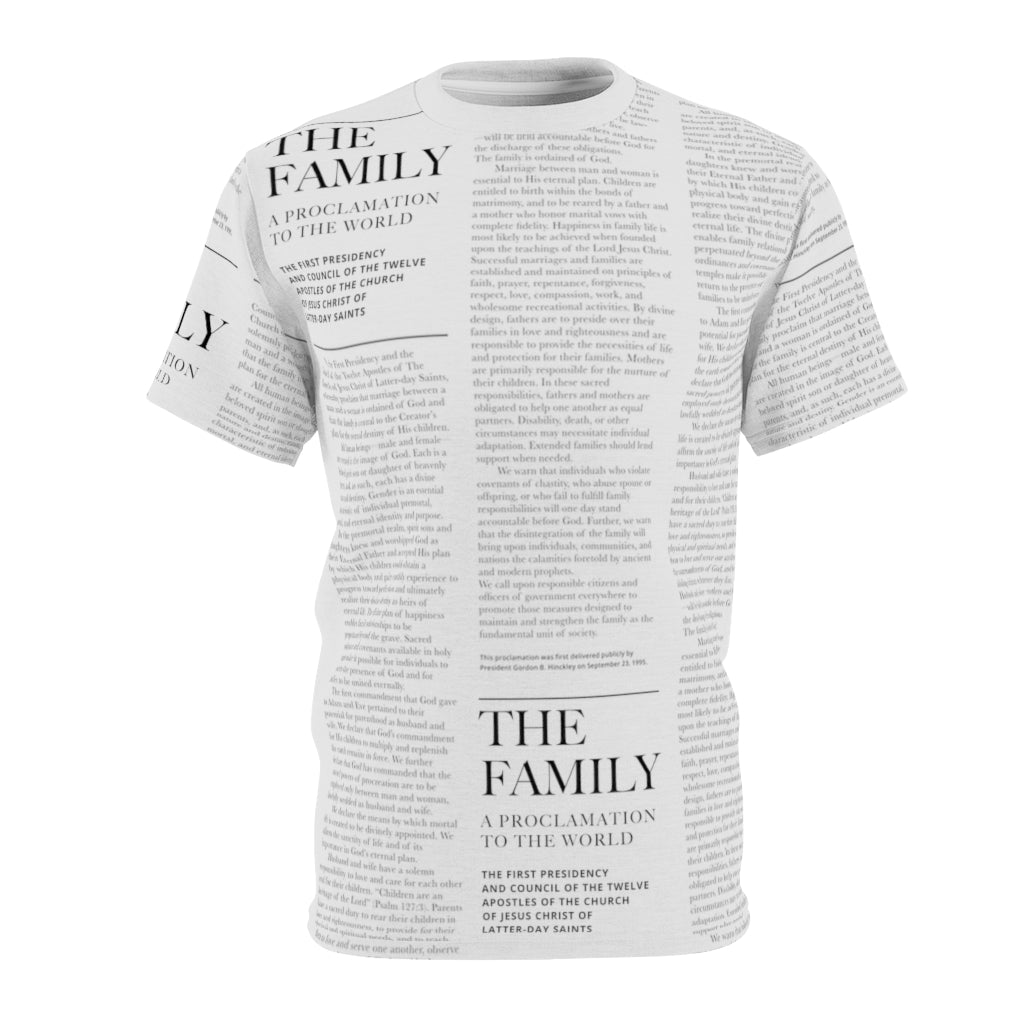 If life is not a popularity contest, then this graphic tee will ensure you remain unpopular while you wear it. This t-shirt features the full text of “The Family: A Proclamation to the World”, a landmark document delivered by the Prophet Gordon B. Hinckley at the Women’s Conference in 1995. This document affirms the importance of family, marriage and parenthood in God’s plan. The t-shirt is printed on fabric, then cut and sewn for a custom fit. It has:
