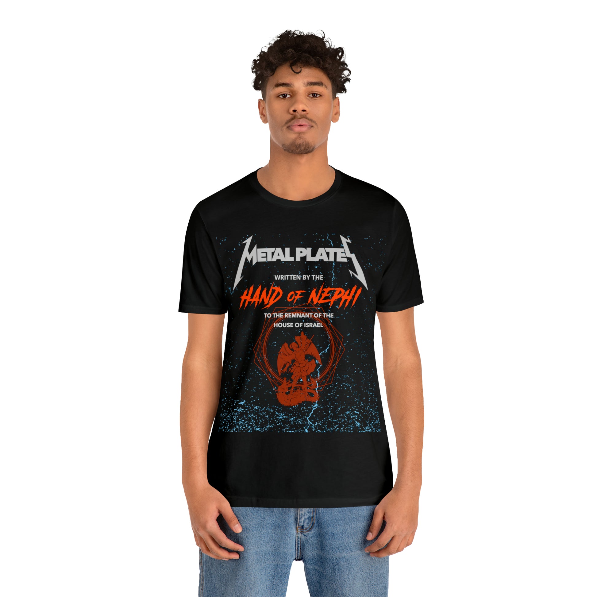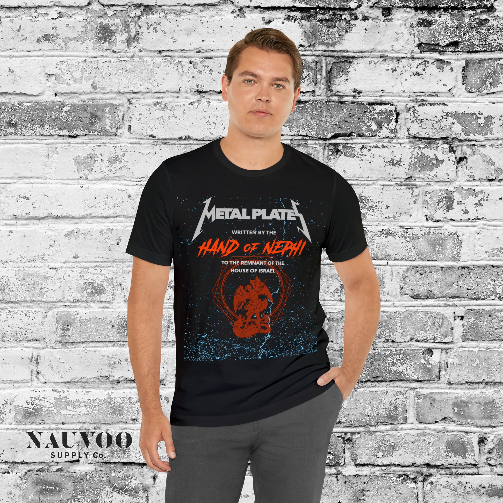 This fun Book of Mormon shirt features hand-drawn lettering in the style of iconic heavy metal bands. The text is from the title page of the Book of Mormon and says, "Metal Plates written by the hand of Nephi for the remnant of the house of Israel" which we all know can only mean the Book of Mormon.