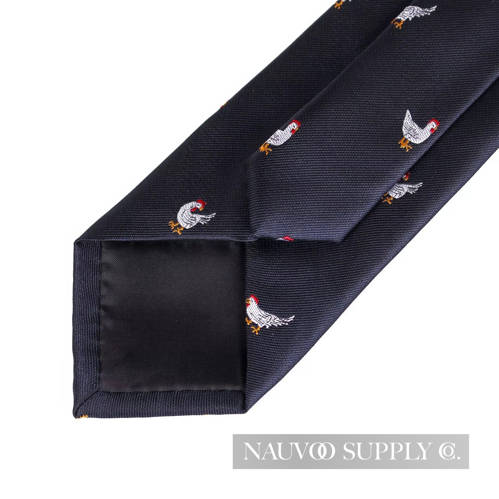 For the homesteaders out there. White chickens (hens, naturally) in various chicken-ish poses on a black tie. This tie is a classic from a distance, tastefully based at close range. Range, see what we did there.